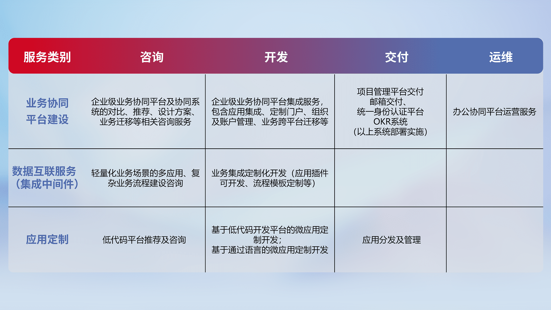 针对钉钉、、、、企微、、IDaas等平台级产品提供产品的规划、、、、方案、、交付、、、定制化开发等服务,,实现如统一协同办公、、智能客户服务、、混合会议管理、、智能数据查询、、、等业务场景,,实现数字化转型。。。